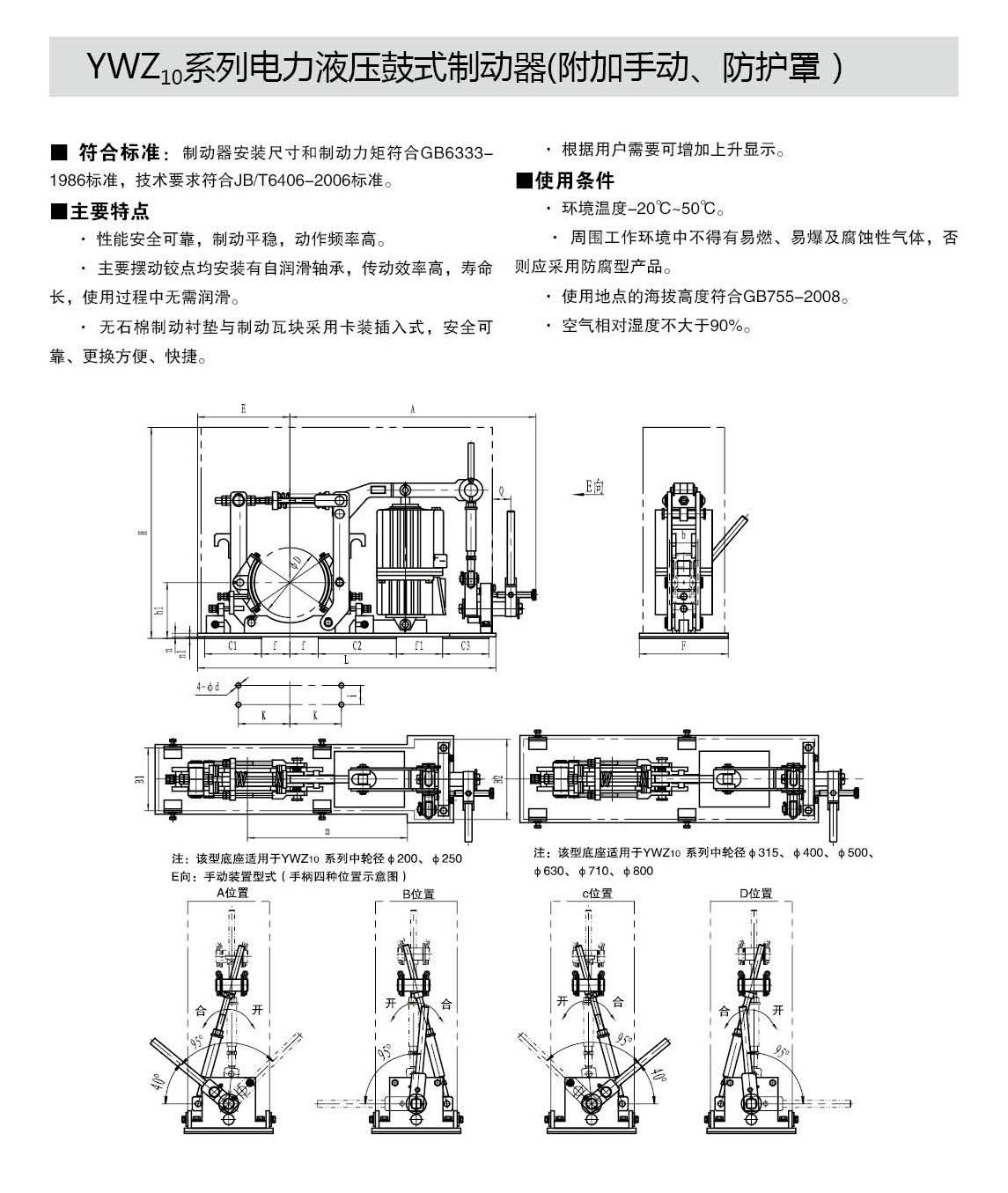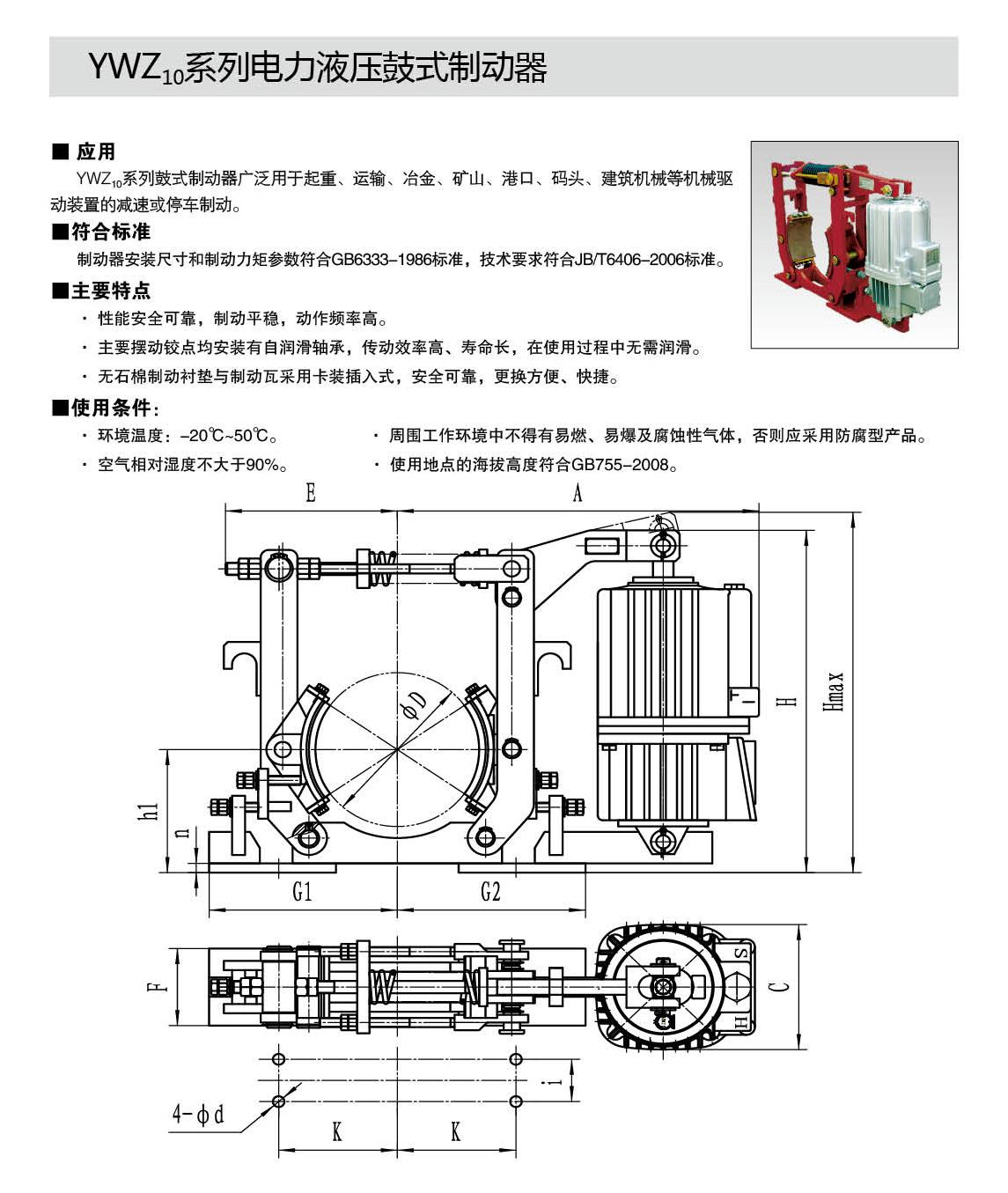 YWZ10,YWZ12系列電力液壓鼓式制動(dòng)器的連接尺寸和制動(dòng)力矩參數(shù)符合GB6333-86標(biāo)準(zhǔn),技術(shù)要求符合JB / T6406-2006標(biāo)準(zhǔn),配套符合DIN15430標(biāo)準(zhǔn)的Ed系列推動(dòng)器。