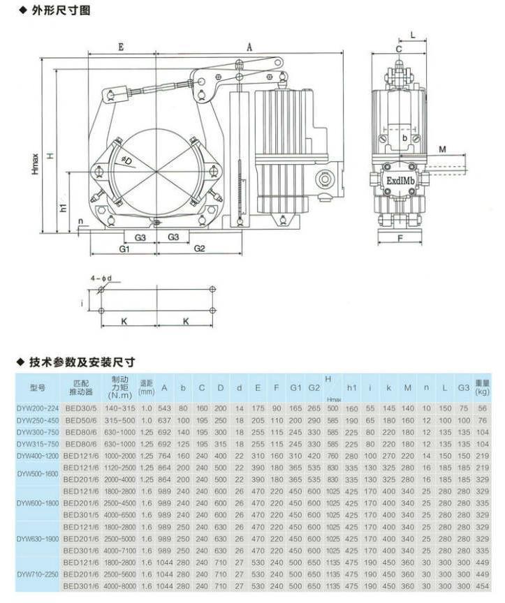 DYW,BYWZ5系列制動(dòng)器連接尺寸和技術(shù)要求符合JB/T6406-2006標(biāo)準(zhǔn),制動(dòng)力矩參數(shù)符合DIN15435標(biāo)準(zhǔn)。DYWZ5系列制動(dòng)器連接尺寸和制動(dòng)力矩參數(shù)符合GB6333-86標(biāo)準(zhǔn),技術(shù)要求符合JB/T6406-2006標(biāo)準(zhǔn)。DYW和DYWZ5系列鼓式制動(dòng)器配套符合GB3836.2的Ed系列隔爆型推動(dòng)器。本系列適用ⅡA、ⅡB、ⅡC溫度組別為T1-T4組可燃?xì)怏w與空氣形成的爆炸性混合物場所。