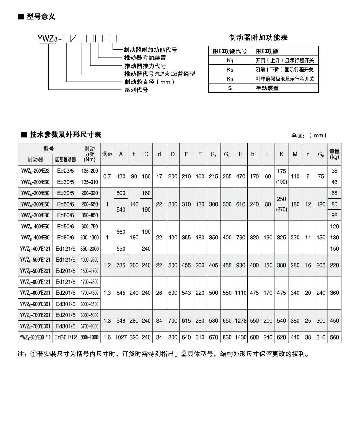 YWZ8.YWP系列電力液壓鼓式制動(dòng)器的連接尺寸和制動(dòng)力矩參數(shù)符合JB/ZQ4388-86和GB6333-86(帶A系列)標(biāo)準(zhǔn),技術(shù)要求符合JB / T6406-2006標(biāo)準(zhǔn),配套符合DIN15430標(biāo)準(zhǔn)的Ed系列推動(dòng)器。